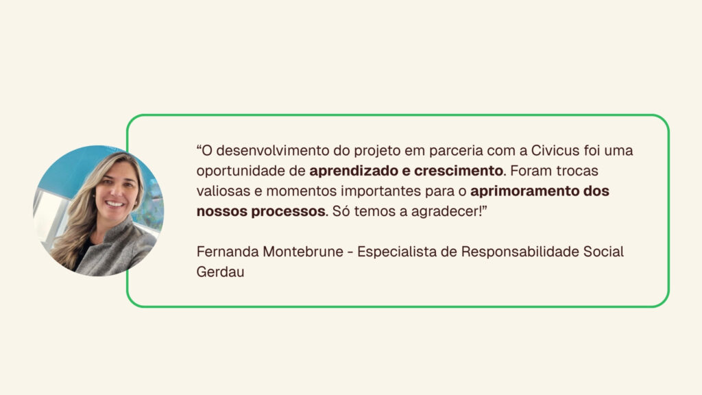 - Planilha de indicadores com IGV – Índice de Geração de Valor (visão dos stakeholders sobre o valor gerado pelo trabalho social da Gerdau), aplicado com setor público, OSCs e lideranças das empresas;